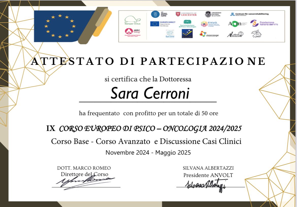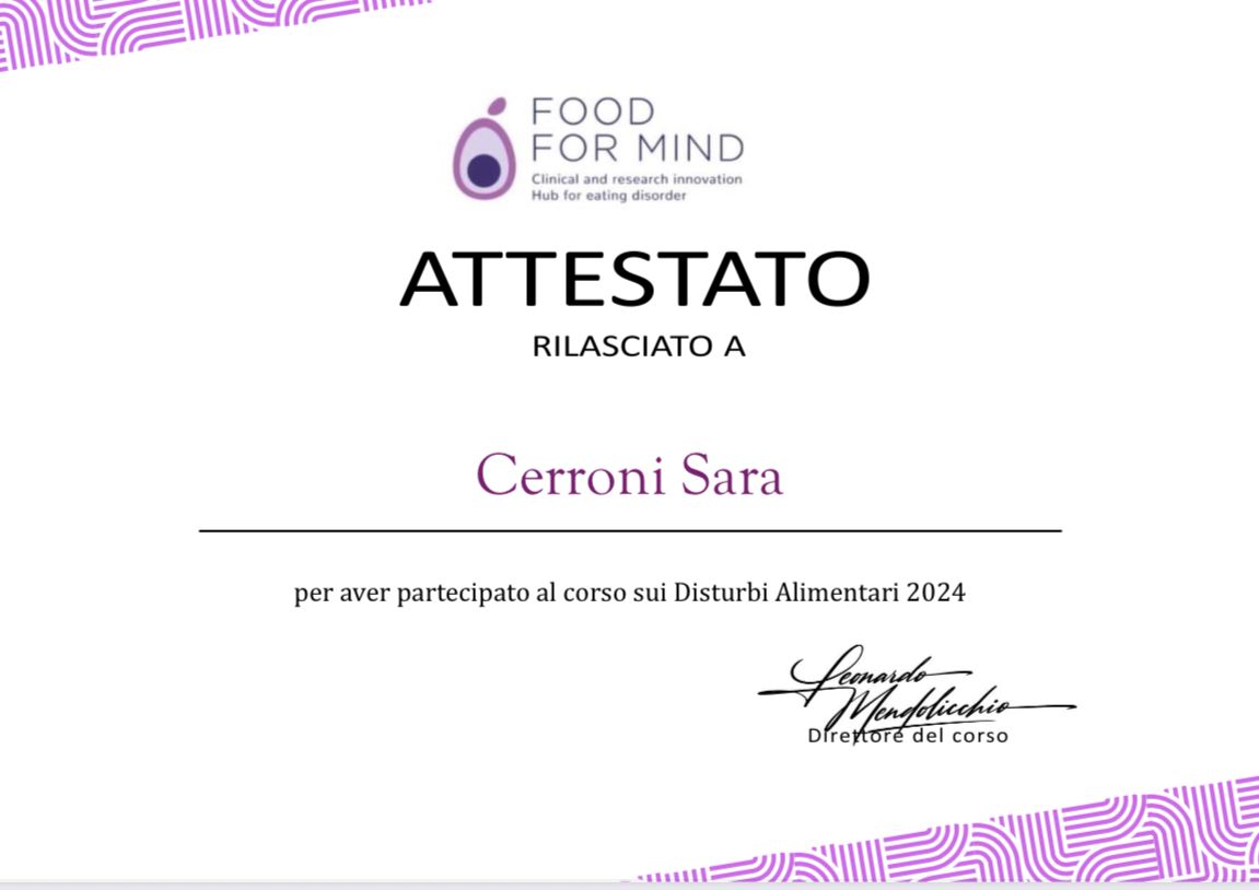Credo profondamente nel valore della formazione continua e mi impegno a mantenere le mie competenze sempre aggiornate attraverso seminari, supervisioni e corsi di approfondimento professionale.